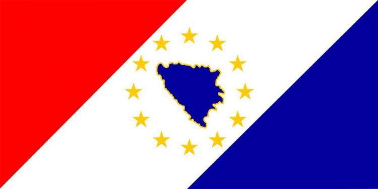 Prvi prijedlog bila je dijagonalna trobojnica sastavljena od crvene, bijele i plave boje. U centru se nalazila plava karta Bosne i Hercegovine, okružena sa 10 žutih zvijezda petokraka.